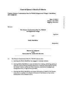 Owners: Condominium Plan No. 7921815 (Pepperwood Village) v. MacMillan (Alberta Court of Queen’s Bench) August 15, 2019