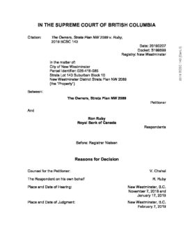 The Owners, Strata Plan NW 2089 v Ruby, 2019 BCSC 143