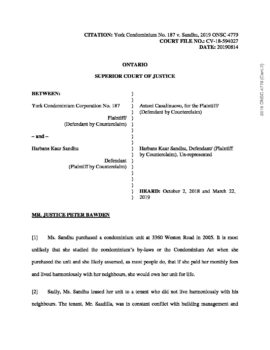 York Condominium No. 187 v. Sandhu (Ontario Superior Court) August 14, 2019